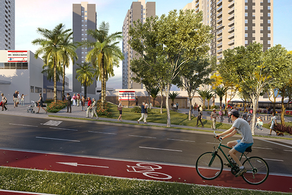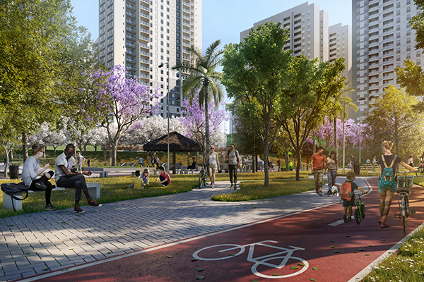 Tudo ao alcance dos pés: ciclovias, áreas verdes e soluções sustentáveis como jardins de chuva.