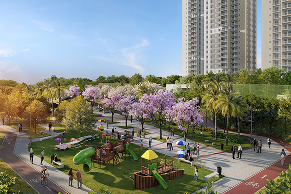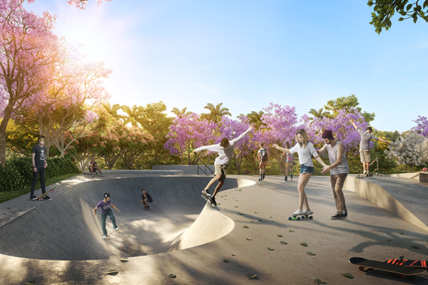 Novo espaço verde com pista de caminhada, área pet, playgrounds, quadra e ampla vegetação. Um parque pensado para lazer, bem-estar e convivência, promovendo saúde e sustentabilidade ao conectar diferentes áreas do bairro.