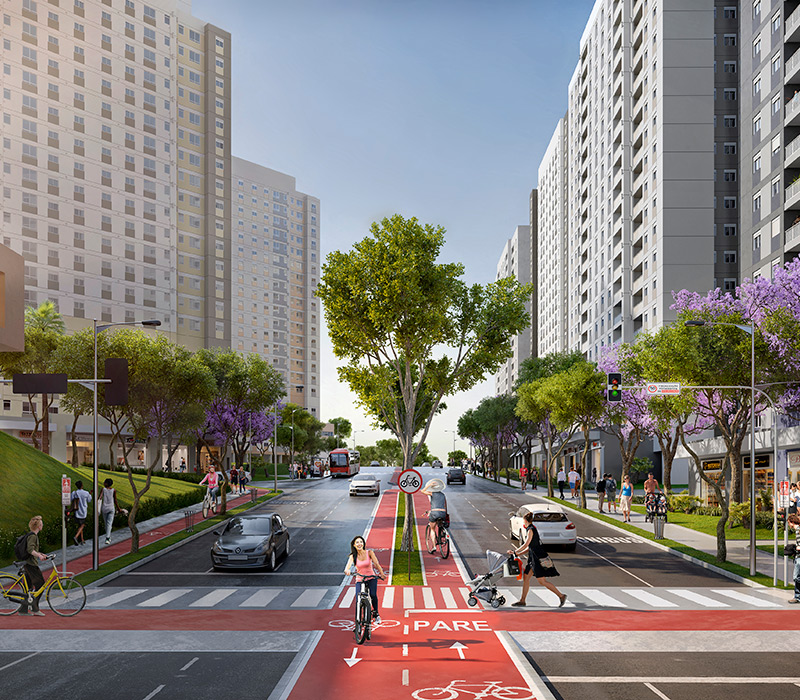 O projeto é inspirado no novo urbanismo, um conceito que valoriza o desenvolvimento sustentável e o bem-estar dos pedestres. Com ciclovias e vias seguras para caminhadas, incentivamos deslocamentos a pé e de bicicleta, contribuindo para um ambiente mais saudável e sustentável. Toda a fiação elétrica é subterrânea, trazendo segurança e um visual limpo e moderno às ruas do bairro.